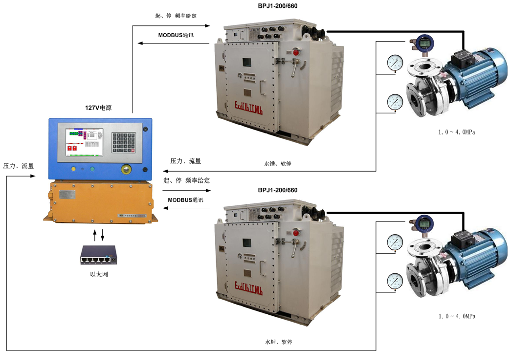 7臺(tái)BPJ1-200/660變頻器用于控制增壓泵實(shí)現(xiàn)恒壓供水,在山西西山晉興能源有限責(zé)任公司斜溝煤礦,于2013年11月投入使用。